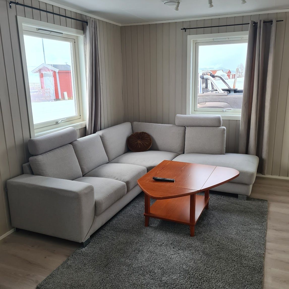 Lys og romslig stue med komfortabel sofagruppe og store vinduer som vender ut mot fjorden. Her kan du slappe av etter en dag ute, nyte utsikten eller koble av med TV og et godt måltid.